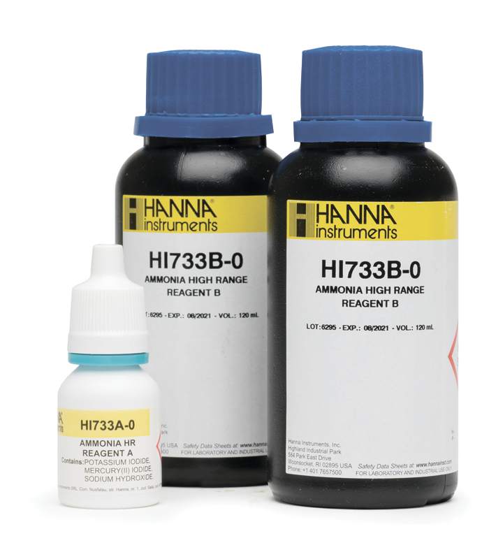 HI733-25 – це високоякісні реагенти, які попередньо відміряні, що дозволяє користувачам швидко та точно проводити вимірювання за допомогою аміаку High Range Checker® HC. Ці реагенти відповідають методу Несслера, при якому реакція між аміаком і реагентами викликає жовтий відтінок в зразку. Просто додайте 9 мл з першого флакона з реагентом та потім 4 краплі з флакона з піпеткою в пробу, відбудеться реакція, і HI733 визначить концентрацію по кольору, що з’явився. Результати будуть відображатися в проміле (мг / л) аміаку-азоту (NH3-N). Ці реагенти призначені для використання зі зразками, які мають очікуваний діапазон від 0,0 до 99,9 проміле амонійного азоту. Щоб перевести показання в проміле аміаку (NH3), помножте результат на 1,214.