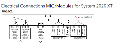 Модуль струмового входу MIQ / IC2 дає два струмових виходи 0/4 … 20 мА для системи IQ SENSOR NET з’єднання зовнішніх вимірювальних приладів відбувається через їх струмовий вихід. Вимірювані значення зовнішніх вимірювальних приладів відображаються, реєструються і обробляються як вимірюється значення від датчиків IQ SENSOR NET.