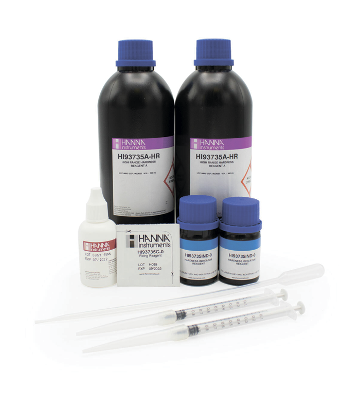 HI93735-02 – это высококачественные реагенты, которые предварительно измерены, что позволяет пользователям получать быстрые и точные колориметрические измерения. Эти реагенты соответствуют адаптации метода 130.1, рекомендованного EPA, в котором реакция между кальцием, магнием и реагентами вызывает красно-фиолетовый оттенок в образце. Просто добавив жидкий реагент A, две капли реагента B и пакет реагента C к образцу, реакция между кальцием и магнием и реагентами вызывает изменение цвета в зависимости от концентрации. Интенсивность цвета определяется совместимым фотометром HI96735 и концентрация будет отображена на дисплее. Результаты отображаются в мг/л (ppm) в виде CaCO3. Эти реагенты предназначены для использования в образцах с ожидаемым диапазоном общей жесткости CaCO3 от 400 до 750 мг/л (ppm).