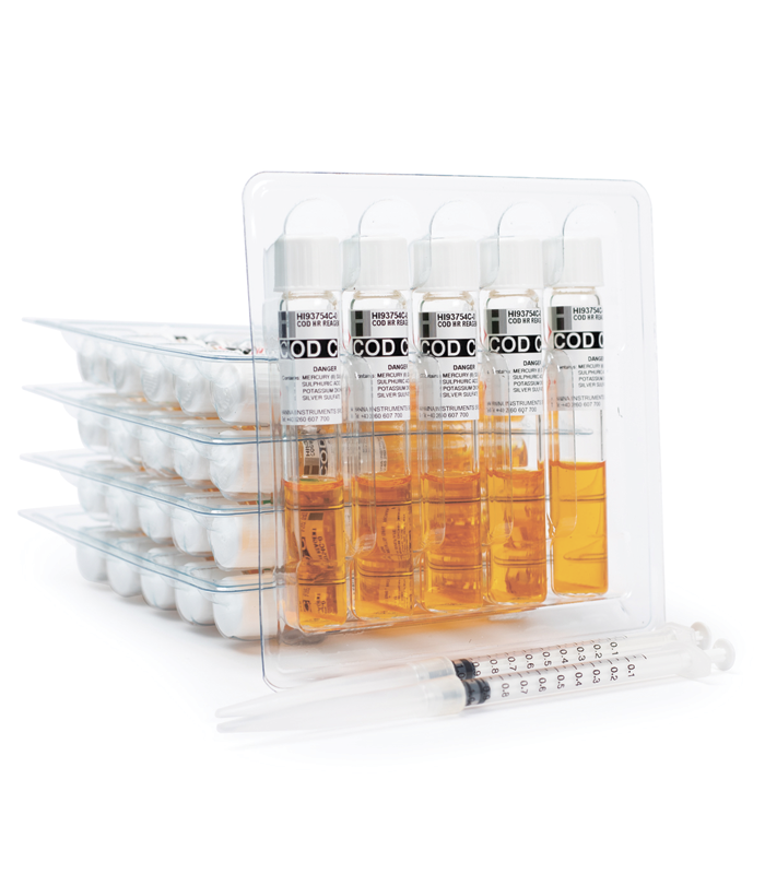 Набор HI93754C-25 COD содержит 25 готовых к использованию предварительно измеренных флаконов с реагентами. Эти высококачественные реагенты соответствуют утвержденному методу EPA 410.4. В этом методе для окисления органических веществ в образце требуется нагрев. В процессе сбраживания шестивалентный хром в реагенте восстанавливается до трехвалентного хрома. Затем количество восстановленного хрома измеряется колориметрически. Интенсивность цвета определяется совместимым фотометром, а концентрация БСК отображается в мг/л (ppm) O2. Эти реагенты предназначены для использования с образцами с ожидаемым диапазоном от 0 до 15 000 мг/л (ppm) O2.